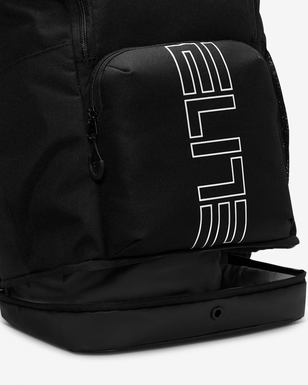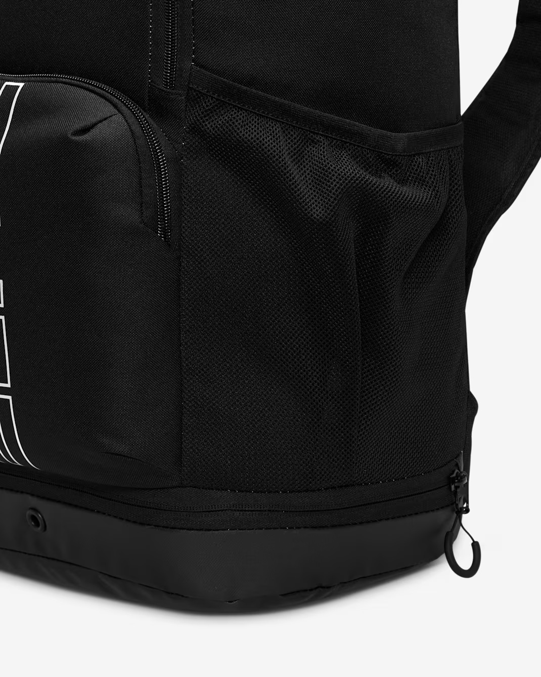 Рюкзак Nike Varsity Elite вміщує все необхідне для гри в баскетбол і подорожей. Просторе основне відділення здатне розмістити баскетбольний м’яч повного розміру. Зовнішня передня кишеня забезпечує швидкий доступ до дрібних речей, а нижнє відділення призначене для зберігання взуття чи вологого одягу, відокремлюючи їх від основних речей.