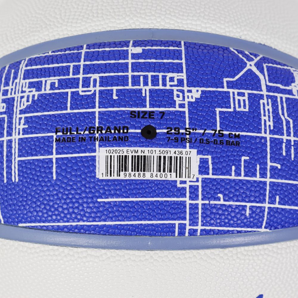 М’яч виконаний у чорному кольорі з контрастними синіми каналами, що не лише додають стильного вигляду, а й покращують контроль під час ведення та кидків. Текстурована поверхня з вираженим pebbled-покриттям забезпечує надійне зчеплення з руками, навіть під час інтенсивної гри.